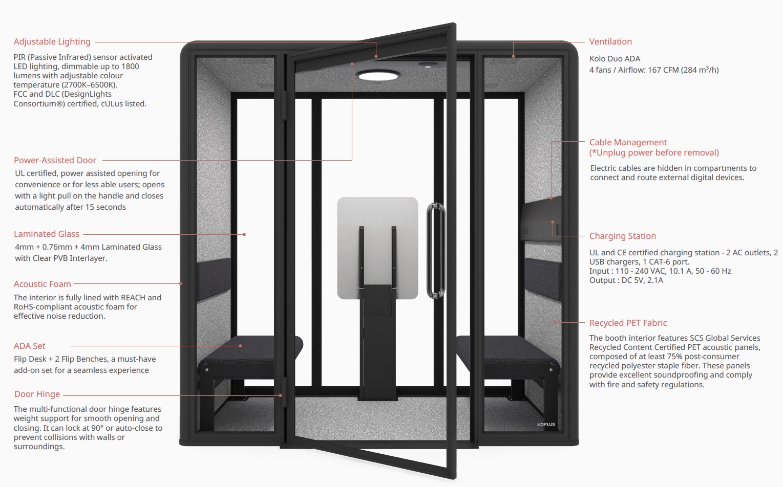 | Usa automata (Automatic Door) Cabina Kolo Duo ADA este echipata cu o usa asistata electric, certificata UL, care se deschide printr-o usoara tragere de maner si se inchide automat dupa 15 secunde (setare implicita). |